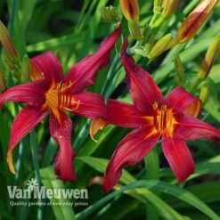 Daylily ‘Crimson Pirate’ produces striking pillar-box red flowers with a yellow throat that each last a day; however these are present on plants for the entire summer. Evergreen Daylily plants are virtually indestructible; they are a resilient, hardy perennial that will flourish in the majority of soils. Hemerocallis plants are ideal in large patio pots or cottage garden borders; they are an ideal choice for both beginners and small gardens, as they are simply very easy to grow. Height: 75cm (30″). Spread: 60cm (24″).
